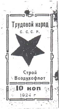 1924 1924 г. Разм. рамки 26 х 48,5 мм. Одноцветная(?) печать на белой(?) бумаге. В центре в прямоугольной рамке перевернутая пятиконечная звезда. Текст в четыре строки: «Трудовой народ С.С.С.Р. Строй Воздухфолот». Ниже под горизонтальной чертой текст в две строки: «10 коп 1924 г.».