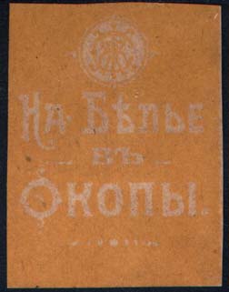 1915 1915(?) г. Разм. ≈ 40 х 53 мм. Одноцветная печать на плотной желто-серой бумаге. Многоцветная печать на белой бумаге. Сверху в круглой рамке монограмма из букв «С.Ж.К.». Ниже текст в три строки: «На белье в окопы».