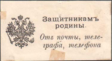 1915 1915(?) г. Всероссийский сбор. Разм. 63 х 33 мм. Одноцветная печать на белой бумаге. Слева герб России. Справа текст в четыре строки: «Защитникам Родины От почты, телеграфа, телефона».