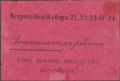 1916 1916 г. 21-23.04.1916 г. Всероссийский сбор. Разм. 70 х 46 мм. Одноцветная печать на розовой бумаге. Сверху текст: «Всероссийский сбор 21,22,23-IV-16». Ниже текст в три строки: «Защитникам Родины От почты, телеграфа, телефона».