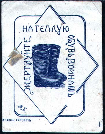 1915 1915(?) г. Разм. 59 х 76 мм. Одноцветная печать на белой бумаге. В прямоугольной рамке с закругленными краями вторая рамке в виде ромба. В центре пара валенок. По периметру рисунка текст: «Жертвуйте на теплую обувь воинам». Слева внизу выходные данные мелким шрифтом: «Лит. инж. Гуревич».