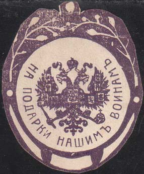1915 1915(?) г. Виньетка в виде щитка сложной формы разм. 48 х 57 мм. Одноцветная печать на белой бумаге. В декоративной рамке с растительным орнаментом в центре герб России. По окружности текст: «На подарки нашим воинам».