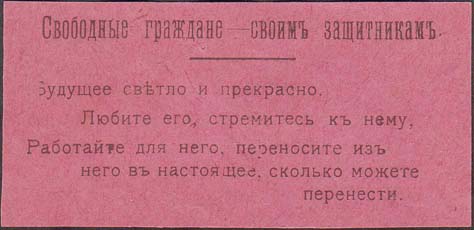 1917 1917 г. Разм. 79 х 38 мм. Одноцветная печать на розово-сероватой бумаге. Сверху текст: «Свободные граждане – своим защитникам». Ниже горизонтальная черта. Внизу текст в пять строк: «Будущее светло и прекрасно. Любите его, стремитесь к нему, работайте для него, перенесите из него в настоящее, сколько можете перенести».