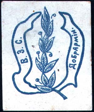 1919 1919(?) г. Разм. 48 х 60 мм. Одноцветная печать на толстой гладкой белой бумаге. В центре лавровая ветвь и лента. На ленте текст: «В.З.С. Добрармии».