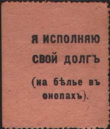 1919 1919 г. Разм. 55 х 29 мм. Одноцветная печать на толстой розоватой бумаге. Зубц. 11 1/2 низ-кого качества. Текст в четыре строки: «Я исполнил свой долг (На белье в окопах)».