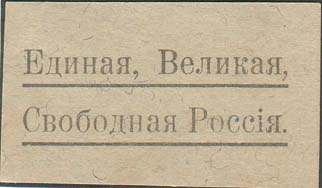 1919 1919 г. Разм. 55 х 29 мм. Одноцветная печать на толстой бумаге различных цветов с вкраплениями волокон. Текст в две строки с подчеркиванием: «Единая, Великая, Свободная Россия».