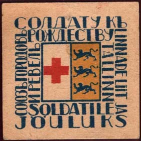 1916 1916 г. Разм. 46 х 46 мм. Трехцветная печать на желто-ватой бумаге. В центре в рамке разм. 20 х 20 мм слева красный крест, справа герб г. Ревеля. По периметру текст на русском и эстонском языках: «Союз городов и Ревель солдату к Рождеству».