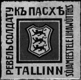 1916 1916 г. Разм. 46 х 46 мм. Двухцветная печать на свет-ло-серой бумаге. В центре в рамке разм. 26 х 26 мм герб г. Ревеля. По периметру текст на русском и эстонском языках: «Ревель солдату к Пасхе».