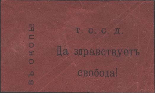 1917 1917 г. Август. Разм. 87 х 52 мм. Одноцветная печать на тонкой фиолетово-красной бумаге. Слева вертикально снизу вверх текст в одну строку: «В окопы!». Справа текст в три строки: «Т.С.С.Д. Да здравствует свобода!».