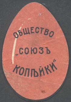 1915 1915(?) г. Виньетка в форме яйца разм. 37 х 54 мм. Двухцветная печать на белой бумаге. Пасхальное яйцо с текстом в три строки: «Общество «Союз Копейки»».