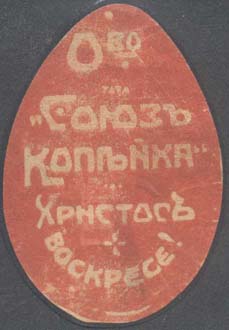 1915 1915(?) г. Виньетка в форме яйца разм. 37 х 54 мм. Одноцветная печать на желтоватой бумаге. Пасхальное яйцо с текстом в пять строк: «О-во «Союз Копейки». Христос воскресе!».