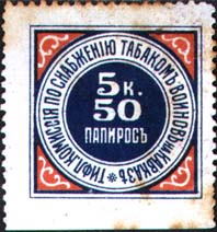 1915 1915 г. Разм. рамки 26 х 26 мм. Двухцветная печать на белой бумаге. Зубц. 11 1/2. В центре в круглой рамке двойной номинал (в копейках и папиросах). По окружности текст: «Тифл[исская]. Комиссия по снабжению табаком воинов на Кавказе».