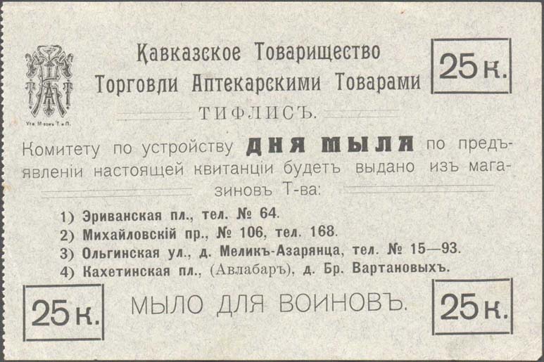 1915 1915 г. Квитанция разм. 130 х 88 мм. Одноцветная печать на бумаге различных цветов. Левосторонняя зубц. 11 1/2. В левом верхнем углу вензель из букв: «К.Т.Т.А.Т.», в остальных углах номинал в рамках. В центре текст в одиннадцать строк: «Кавказское Товарищество Торговли Аптекарскими Товарами в Тифлисе. Комитету по устройству ДНЯ МЫЛА по предъявлении настоящей квитанции будет выдано из магазинов Т-ва: 1) Эриванская пл[ощадь]., тел[ефон]. №64. 2) Михайловский пр[оспект]., №106, тел[ефон]. 168. 3) Ольгинская ул[ица]., д. Мелик-Азарянца, тел[ефон]. №15-93. 4) Кахетинская пл[ощадь]., (Авлабар), д. Бр[атьев]. Вартановых. МЫЛО ДЛЯ ВОИНОВ.».
