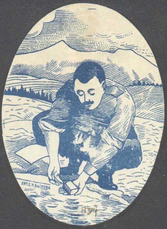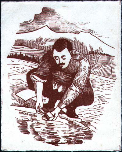 1915 1915 г. Разм. 63 х 82 мм. Одноцветная печать на бумаге различных цветов. Солдат моет руки мылом в реке на фоне гор. Слева внизу мелким шрифтом выходные данные: «Лит. С.М. Быхова».