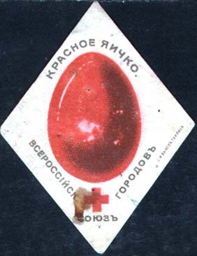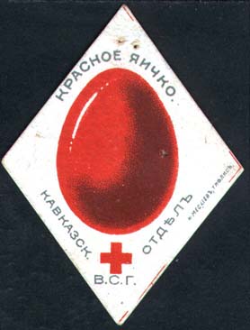 1915 1915(?) г. Ромб разм. 45 х 60 мм. Двухцветная печать на желтоватой бумаге. В центре пасхальное яйцо. Сверху полукругом текст: «Красное яичко». Вни-зу красный крест и различные тексты. Справа параллельно нижней стороне ромба мелким шрифтом выходные данные: «С.М.Быхова, Тифлис».