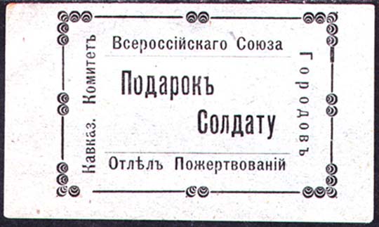 1915 1915(?) г. Разм. ≈ 67 х 46 мм. Одноцветная печать на бумаге различных цветов. В декоративной рамке разм. ≈ 52 х 34 мм в центре текст в две строки: «Подарок Солдату». По периметру текст: «Кавказ[ский]. Комитет Всероссийского Союза Городов. Отдел Пожертвований».