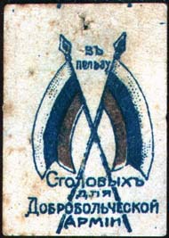 1919 1919(?) г. Разм. 31 х 44 мм. Двухцветная печать на желтоватой бумаге. В центре два скрещенных российских флага. Сверху текст в две строки: «В пользу». Внизу продолжение текста в четыре строки: «Столовых для Добровольческой Армии».