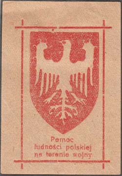 1917 1917(?) г. Разм. 50 х 71 мм. Одноцветная печать на тонкой желтоватой бумаге. В прямоугольной разм. 35 х 56 мм щиток с гербом Польши. Внизу текст в три строки на польском языке: «Помощь польскому населению на территории, пострадавшей от войны(?)».