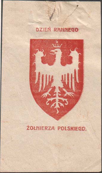 1917 1917(?) г. Разм. 58 х 96 мм. Одноцветная печать на желтоватой бумаге. В центре на фоне щитка сложной формы одноглавый орел. Сверху текст на польском языке: «День раненого». Внизу продолжение текста на польском языке: «Польского солдата».