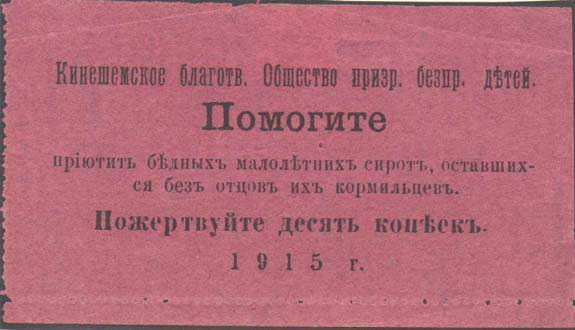 1915 1915 г. Квитанция разм. 96 х 56 мм. Одноцветная печать на темно-красной бумаге. Левосторонняя зубц. 11. В центре текст в шесть строк: «Кинешемское благотв[орительное]. Общество призр[ения]. беспр[изорных]. детей. Помогите приютить бедных маленьких сирот, оставшихся без отцов их кормильцев. Пожертвуйте десять копеек. 1915 г.».