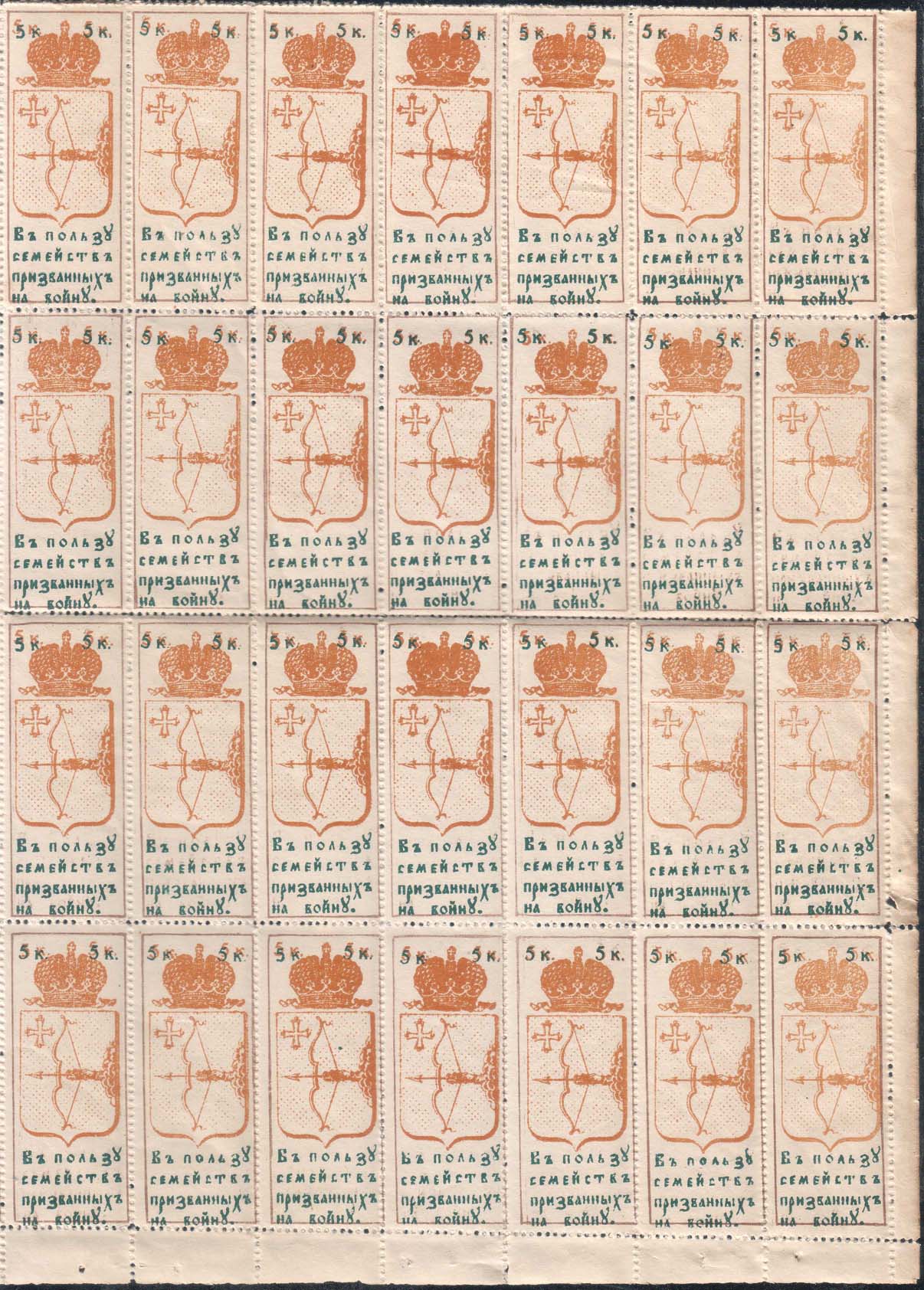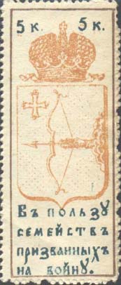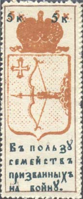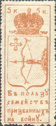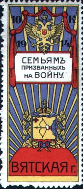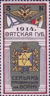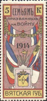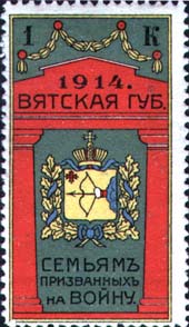 1915 1915 г. Разм. рамки 25 х 64 мм. Двухцветная и трехцветная печать на белой бумаге. Зубц. 11 1/2. С клеем. В прямоугольной рамке в центре герб Вятской губернии. Сверху в углах номинал. Внизу текст в четыре строки: «В пользу семейств призванных на войну».