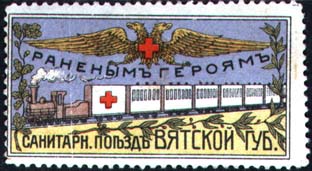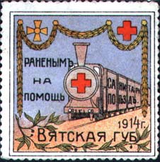 1914 1914 г. Разм. рамки 48 х 24 мм. Многоцветная печать на белой бумаге. Зубц. 11 1/2. С клеем. В двойной прямоугольной рамке в центре санитарный поезд. Сверху двухглавый орел с красным крестом на груди и текст: «Раненым героям». Внизу текст: «Санитарн[ый]. поезд Вятской губ[ернии].».