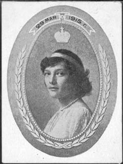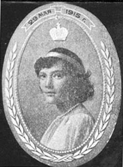 1915 1915 г. 29.05.1915 г. Всероссийский сбор. Разм. 42,5 х 57 мм. Одноцветная печать на белой бумаге. В овальной декоративной рамке в центре портрет Великой Княжны Татьяны Николаевны. Сверху на ленте да-та: «29 мая 1915 года».