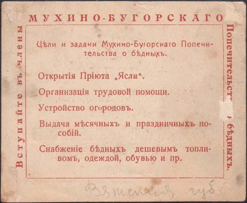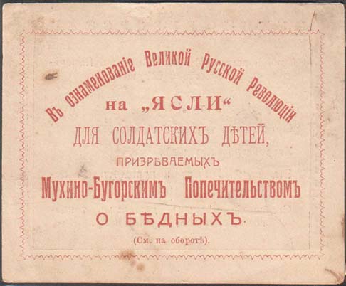1917 1917 г. Разм. 81 х 66 мм. Одноцветная двухсторонняя печать на гладкой желтоватой бумаге. На лице-вой стороне в прямоугольной декоративной рамке разм. 71 х 53 мм текст в семь строк: «В ознаменование Великой Русской Революции на «Ясли» для солдатских детей, призреваемых Мухино-Бугорским Попечительством о бедных (См. на обороте)». На оборотной стороне в прямоугольной рамке разм. 66 х 50 мм текст в девять строк: «Цели и задачи Мухино-Бугорского Попечительства о бедных. Открытие приюта «Ясли». Организация трудовой помощи. Устройство огородов. Выдача месячных и праздничных пособий. Снабжение бедных дешевым топливом, одеждой, обувью и пр.». По наружному периметру рамки текст: «Вступите в члены Мухино-Бугорского Попечительства о бедных».