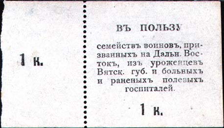 1905 1905 г. Листок из квитанционной книжки разм. 86 х 44 мм. Одноцветная печать на сероватой бумаге. Левостороння зубц. 11 1/2. На квитанции в центре текст в семь строк: «В пользу семейств воинов, призванных на Дальн[ий]. Восток, из уроженцев Вятск[ой]. губ[ернии]. и больных и раненых полевых госпиталей». Внизу номинал. На корешке в центре номинал.