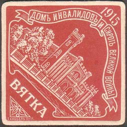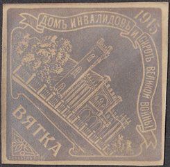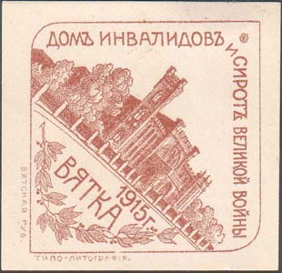 1915 1915 г. 02.-03.11.1915 г. Ромб разм. 71 х 71 мм. Одноцветная печать на белой бумаге. В рамке в форме ромба разм. рамки 43 х 43 мм в центре дом инвалидов и сирот. Сверху по внутреннему периметру рамки текст: «Дом инвалидов и сирот великой войны». Внизу текст в две строки: «1915 г. Вятка» и лавровая ветвь. Внизу под рамкой мелким шрифтом выходные данные: «Вятская губ. типолитография».