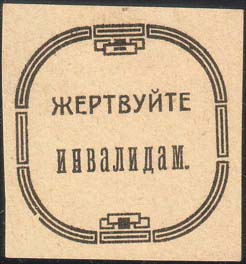 1915 1915(?) г. Разм. ≈ 44 х 44 мм. Одноцветная печать на толстой светло-желтой бумаге. В центре в декоративной квадратной с закругленными углами рамке разм. 36 х 36 мм текст в две строки: «Жертвуйте инвалидам».