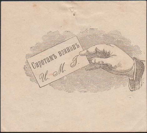 1915 1915(?) г. Разм. 79 х 70 мм. Одноцветная печать на белой бумаге. В центре рука, держащая листок с текстом в две строки: «Сиротам воинов И.М.Г.».
