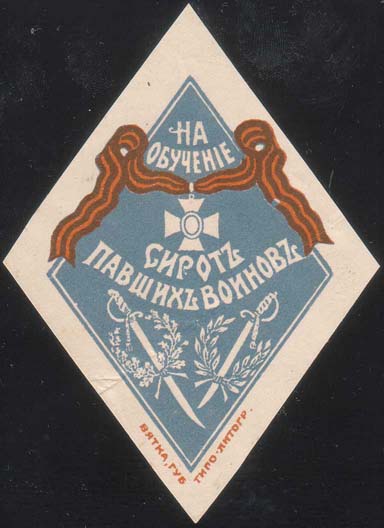 1916 1916 г. 20.05.1916 г. Ромб разм. 48 х 66 мм. Трехцветная печать на белой бумаге. Сверху Георгиевский крест на ленте, внизу две сабли и венки. Текст в четыре строки: «На обучение сирот павших воинов». Внизу под рамкой выходные данные мелким шриф-том: «Вятка, губ. Типо-литогр.».