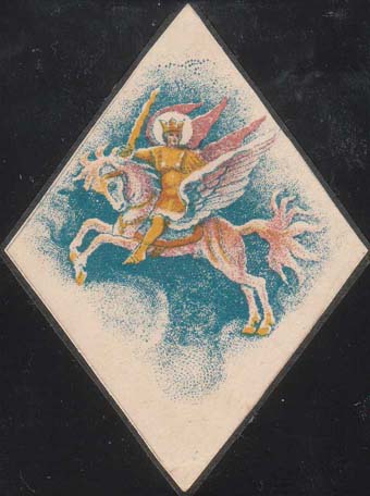 1916 1916 г. 26.10.1016 г. Ромб разм. 61 х 76 мм. Трехцветная печать на белой бумаге. Георгий Победоносец на коне с мечом в руке на фоне облаков.