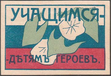 1916 1916 г. Разм. 61 х 42 мм. Трехцветная печать на белой бумаге. В прямоугольной рамке разм. 55 х 35 мм в центре на фоне российского флага цветы и текст в две строки: «Учащиеся - детям героев».