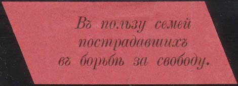 1917 1917(?) г. Виньетка в форме параллелограмма разм. 68 х 27 мм. Одноцветная печать на розовой бумаге. В центре текст в три строки: «В пользу семей пострадавших в борьбе за свободу».