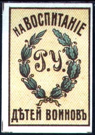 1915 1915(?) г. Разм. рамки 28 х 41,5 мм. Трехцветная печать на белой бумаге. В прямоугольной рамке на сетчатом фоне в центре аббревиатура: «Р.У.» в обрамлении венка. Сверху полукругом текст: «На воспитание». Внизу продолжение текста: «Детей воинов».