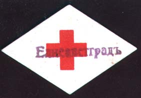 1915 1915(?) г. Ромб разм. 46 х 30 мм. Одноцветная печать на белой бумаге. В центре красный крест. Сверху фиолетовая надпечатка ручным каучуковым штампом текста: «Елизаветград».