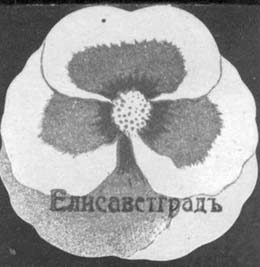 1915 1915(?) г. Виньетка сложной формы в виде цветка разм. ≈ 44 х 43 мм. Трехцветная печать на белой бумаге. Внизу фиолетовая надпечатка ручным каучуковым штампом текста: «Елисаветград».