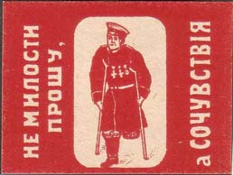 1915 1915(?) г. Разм. 43 х 33 мм. Одноцветная печать на белой бумаге. В центре инвалид войны на костылях. Слева вертикально снизу вверх текст в две строки: «Не милости прошу,». Справа вертикально снизу вверх продолжение текста: «А сочувствия».
