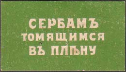 1916 1916(?) г. Разм. 41 х 25 мм. Одноцветная печать на белой бумаге. В центре на сплошном фоне текст в три строки: «Сербам томящимся в плену».