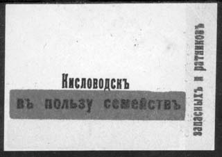 1915 1915(?) г. Разм. 64 х 44 мм. Трехцветная печать на белой бумаге. В центре текст в две строки: «Кис-ловодск в пользу семейств». Справа вертикально снизу вверх продолжение текста: «Запасных и ратников».