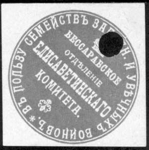 1915 1915(?) г. Ромб разм. 57 х 57 мм. Одноцветная печать на белой бумаге. В круглой рамке диаметром 37 мм в центре на сплошном фоне текст в четыре строки: «Бессарабское отделение Елизаветинского комитета». Сверху императорская корона, внизу декоративный элемент. По внутреннему периметру рамки текст: «В пользу семейств запасн[ых]. и увечных воинов».