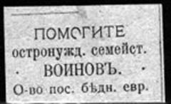 1917 1917 г. Разм. 42 х 26 мм. Одноцветная печать на бумаге различных цветов. В центре текст в четыре строки: «Помогите остронужд[ающимся]. се-мейст[вам]. воинов. О-во пос[обия]. бедн[ым]. евр[еям].».