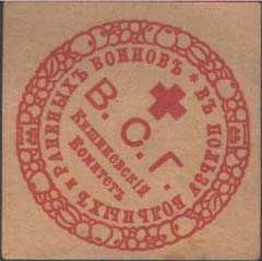 1915 1915(?) г. Ромб разм. 40 х 40 мм. Одноцветная печать на сероватой бумаге. В декоративной круглой рамке с растительным орнаментом в центре текст в три строки: «В.С.Г. Кишиневский Комитет». Сверху красный крест. По внутреннему периметру рамки текст: «В пользу больных и раненых воинов».