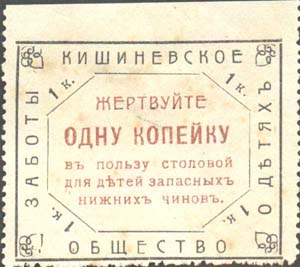 1914 1914(?) г. Разм. рамки 44 х 32 мм. Двухцветная печать на белой бумаге. Зубц. 11 1/2. В прямоугольной рамке в центре дополнительная восьмиугольная рамка. В восьмиугольной рамке в центре текст в пять строк: «Жертвуйте одну копейку в пользу столовой для детей запасных нижних чинов». По периметру между рамками текст: «Кишиневское общество заботы о детях».