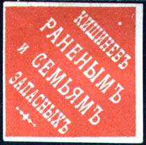 1916 1916(?) г. Ромб разм. 48 х 48 мм. Одноцветная печать на плотной белой бумаге. В центре на сплошном фоне текст в четыре строки: «Кишинев раненым и семьям запасных». Внизу декоративный элемент.