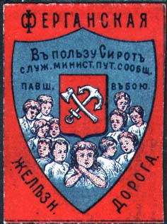 1916 1916 г. 17.09.1916 г. Всероссийский сбор. Разм. 38 х 52 мм. Трехцветная печать на белой бумаге. В центре на сплошном фоне в рамке в виде фигурного щитка группа детей и путейский значок. Сверху текст в три строки: «В пользу Сирот служ[ащих]. минист[ерства]. пут[ей]. сообщ[ения]. Павш[их]. в бою». По периметру щитка текст: «Ферганская железн[ая]. дорога».