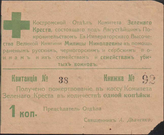 1914 1914(?) г. Квитанция разм. ≈ 108 х 88 мм. Одноцветная двухсторонняя печать на тонкой сероватой бумаге. На лицевой стороне в левом верхнем углу знак Зеленого Креста. Сверху над горизонтальной чертой текст: «Костромской Отдел Комитета Зеленого Креста, состоящего под Августейшим Покровительством Ее Императорского Высочества Великой Княгини Милицы Николаевны в помощь раненым русским, черногорским и сербским воинам и их семействам и семействам убитых воинов». Ниже под горизонтальной чертой текст: «Квитанция №... Книжка №... Получено пожертвование в кассу Комитета Зеленого Креста в количестве одной копейки. 1 коп. Председатель Отдела Священник А. Дьяченко. На оборотной стороне текст в пятнадцать строк: «Председатель Костромского Отдела Комитета Зеленого Креста, свидетельствуя свое почтение, благодарит Вас за пожертвование одной копейки на благое дело. Не смущайтесь! Как ни мала копейка, но, если Вас, жертвователей будет много, то по пословице с миру по нитке – го-лому рубашка. Раненые нуждаются в лечении и уходе, а после убитых в боях воинов остаются сироты, коим угрожает нищета со всеми ужасами и последствиями для них и для общества, которое нравственно обязано помочь им до возраста- Поэтому очень прошу каждого сочувствующего помочь мне в собирании по одной копейке только среди родных и знакомых. Книжка по 50 коп. каждая высылается по требованию. Обращаться к Председателю. (Кострома Нижня Дебря, д. Кабанова) – всякое даяние благо. Помогите раненым и их семействам; женам и детям воинов, павших в бою при защите родины и каждого из нас». Внизу текст: «Председатель отдела священник А.Дьяченко».