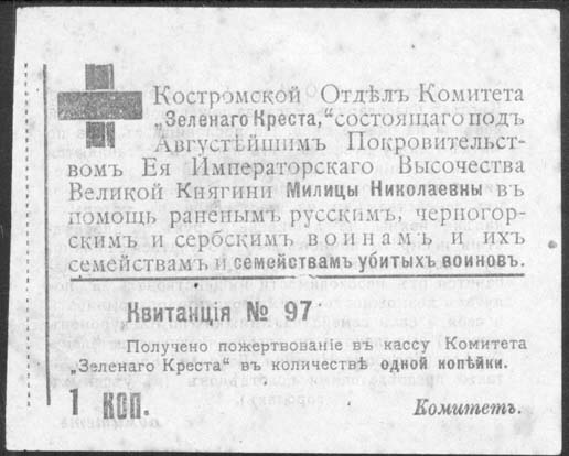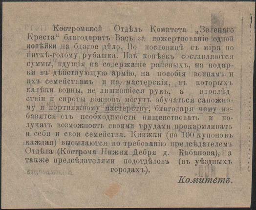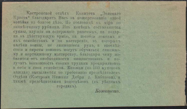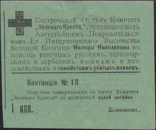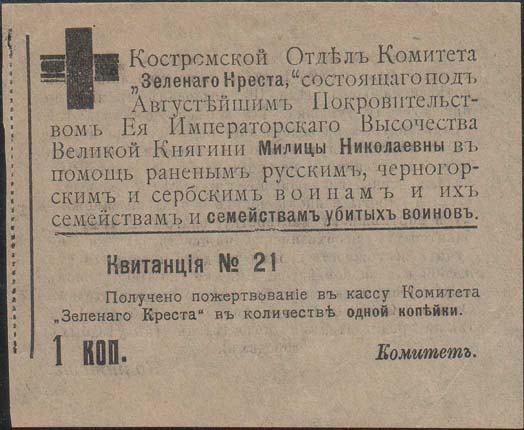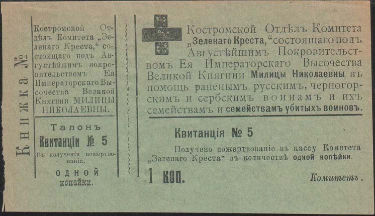 1915 1915(?) г. Квитанция разм. ≈ 90 х 72 мм. Одноцветная двухсторонняя печать на тонкой бумаге различных цветов. На лицевой стороне в левом верхнем углу знак Зеленого Креста. Сверху над горизонтальной чертой текст: «Костромской Отдел Комитета «Зеленого Креста», состоящего под Августейшим Покровительством Ее Императорского Высочества Великой Княгини Милицы Николаевны в помощь раненым русским, черногорским и сербским воинам и их семействам и семействам убитых воинов». Ниже под горизонтальной чертой текст: «Квитанция N.. Получено пожертвование в кассу Комитета «Зеленого Креста» в количестве одной копейки. 1 коп. Комитет». На оборотной стороне текст в семнадцать строк: «Костромской Отдел Комитета «Зеленого креста» благодарит Вас за пожертвование одной копейки на благое дело. По пословице с миру по нитке – голому рубашка. Из копеек складываются суммы, идущие на содержание раненых, на подарки в действующую армию, на пособия воинам и их семействам и на мастерские, в которых калеки войны, не лишившиеся рук, а в последствии и сироты воинов могут обучаться сапожному и портняжному мастерству, благодаря чему избавятся от необходимости нищенствовать и получат возможность своими трудами прокармливать и себя и свои семейства. Книжки (по 100 купонов каждая) высылаются по требованию председателем Отдела (Кострома Нижня Дебря, д. Кабанова), а также председателями подотделов (в уездных городах)». В правом нижнем углу текст: «Комитет». На корешке две вертикальные линии и текст в шестнадцать строк: «Костромской Отдел Комитета «Зеленого Креста», состоящего под Августейшим Покровительством Ее Императорского Высочества Великой Княгини Милицы Николаевны. Талон Квитанции №... В получении пожертвования. Одной копейки».